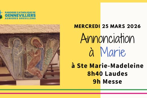 Les rendez-vous du Mercredi 25 mars pour la Solennité de l’Annonciation à Gennevilliers : – 8h40 Prière des laudes à l’église