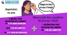 Mercredi des Cendres, 18 février 2026 1° jour de Carême 3 Messes – 9h à Ste Marie Madeleine (Place Jean Grandel) – 12h30 à ND des