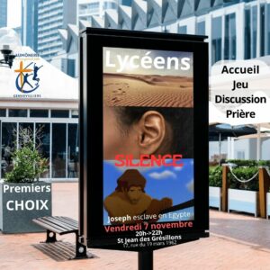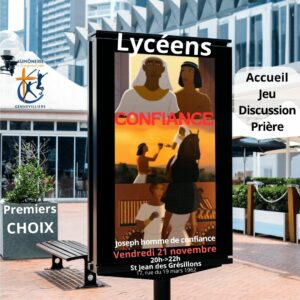 L’Aumônerie des lycéens se retrouve un vendredi sur 2 hors vacances scolaires de 20h à 22h à saint Jean des Grésillons (17, rue du 19 mars 1962)