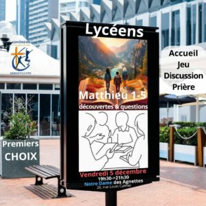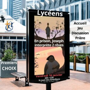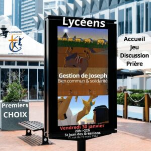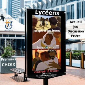 L’Aumônerie des lycéens se retrouve un vendredi sur 2 hors vacances scolaires de 20h à 22h à saint Jean des Grésillons (17, rue du 19 mars 1962)