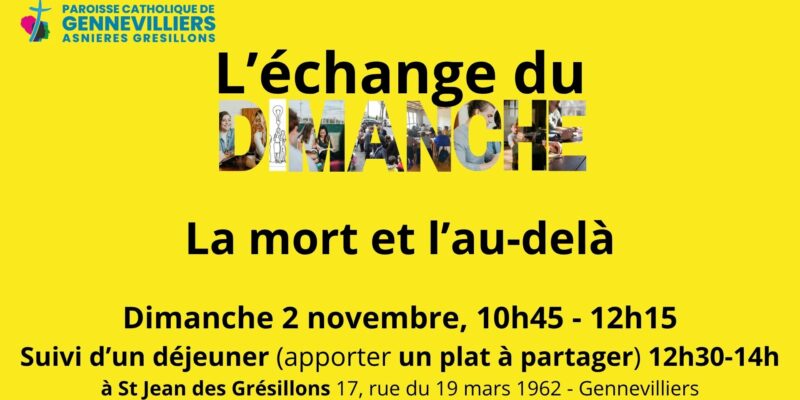 L’échange du dimanche Une proposition toute simple pour nous tous, paroissiens de Gennevilliers et d’Asnières-Grésillons et nos amis : un temps d’échange sur un thème qui nous touche de près, […]Lire la suite