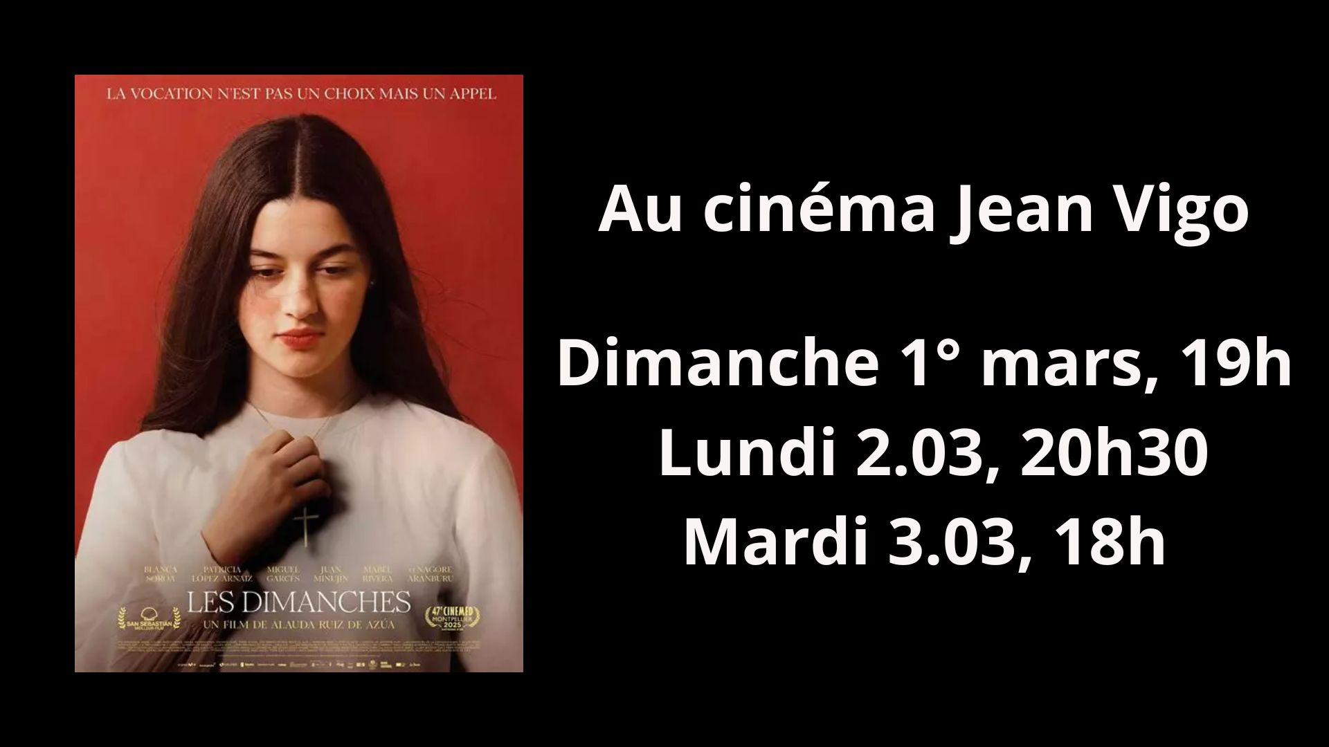 Au cinéma actuellement : « Les Dimanches » au cinéma Jean Vigo de Gennevilliers Ainara, 17 ans, élève dans un lycée catholique, s’apprête à passer son bac et à choisir son […]Lire la suite