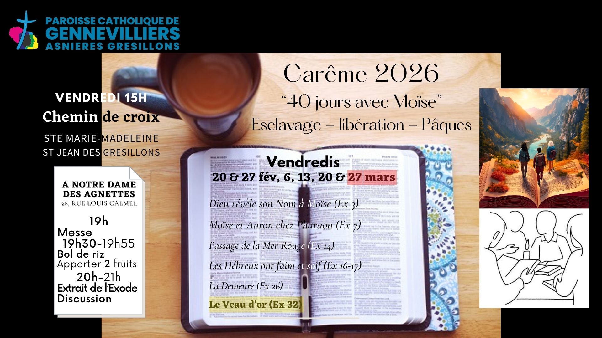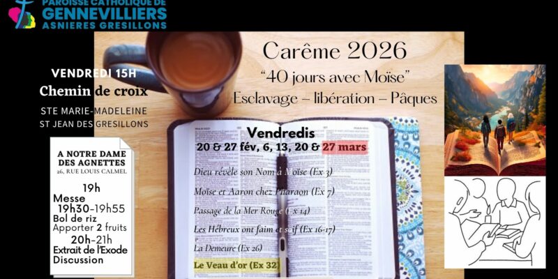Mars 2026 est consacré à la lecture du livre de l’EXODE Semaine 16 : 16-21 mars 2026 : lecture d’Exode 23-28 Les prescriptions de la Loi permettent de gérer les […]Lire la suite