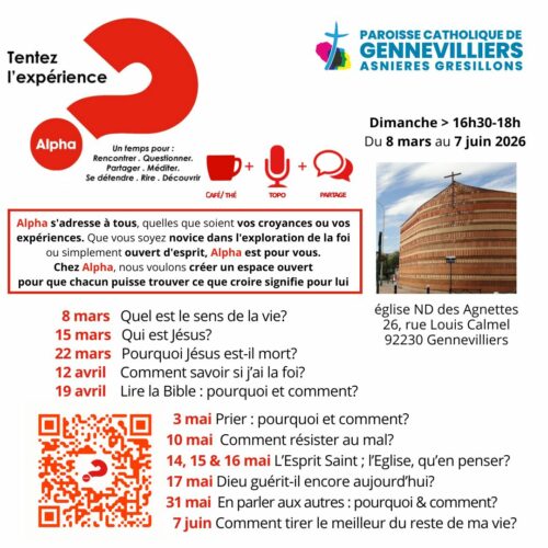 1° rencontre de découverte et de présentation : dimanche 8 mars de 16h30 à 18h, à l’église ND des Agnettes (26, rue Louis Calmel)