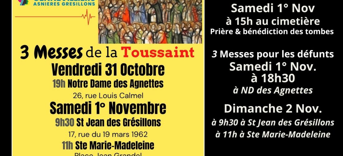 Fête de la Toussaint (1° novembre) 3 Messes à Gennevilliers et Asnières-Grésillons Vendredi 31 octobre à 19h à Notre Dame des Agnettes (26, rue Louis Calmel) Samedi 1° novembre à … Lire la suite de Fête de la Toussaint à Gennevilliers et Asnières-Grésillons (1 & 2.11)