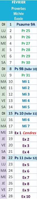 Le mois de FEVRIER 2026 est consacré à la lecture des derniers chapitres du livre des Proverbes et au prophète Michée