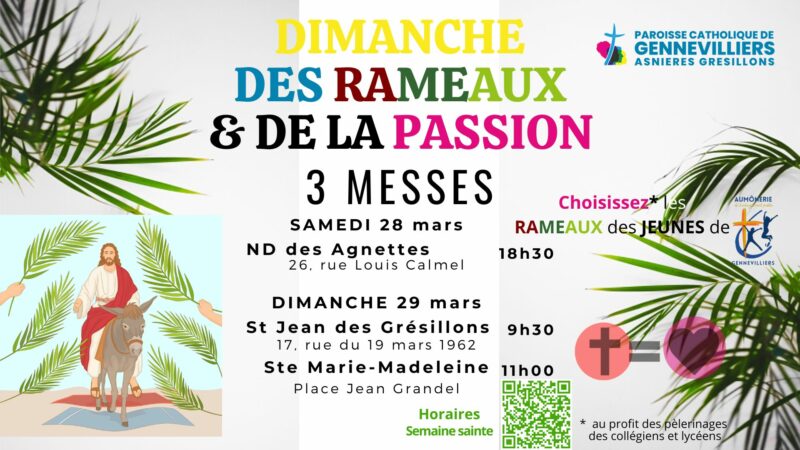 - Dimanche 29 mars, à 9h30 : messe et bénédiction des Rameaux, à St Jean des Grésillons (17, rue du 19 mars 1962)