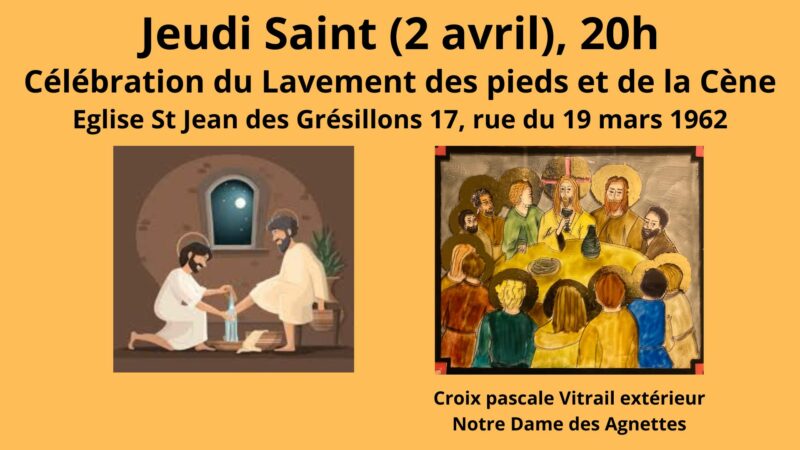 Messe de la Cène et du lavement des pieds, 20h – 21h30 à St Jean des Grésillons, puis reposoir jusqu’à 23h