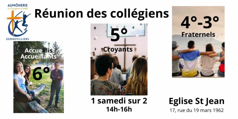 Réunion des collégiens des 4° et des 3° de l’Aumônerie, 1 samedi sur 2 (hors des vacances scolaires), à l’église St Jean des Grésillons (17, rue du 19 mars 1962) […]Lire la suite