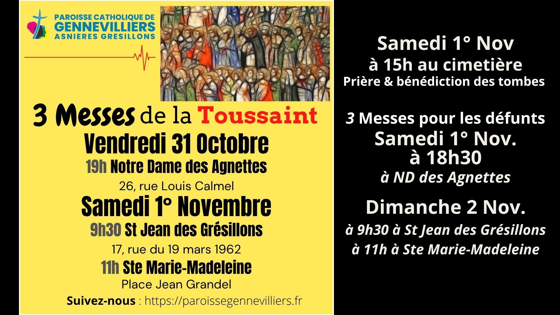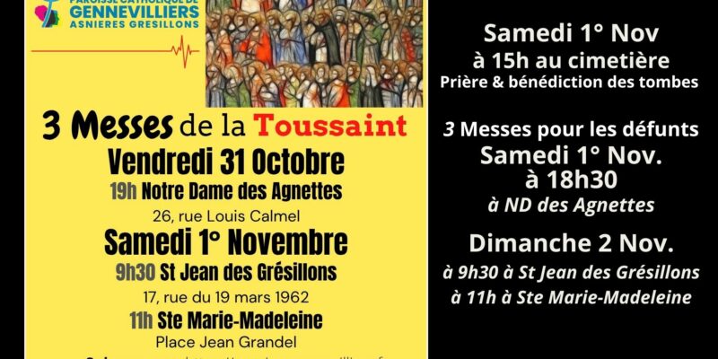 Fête de la Toussaint (1° novembre) 3 Messes à Gennevilliers et Asnières-Grésillons Vendredi 31 octobre à 19h à Notre Dame des Agnettes (26, rue Louis Calmel) Samedi 1° novembre à […]Lire la suite