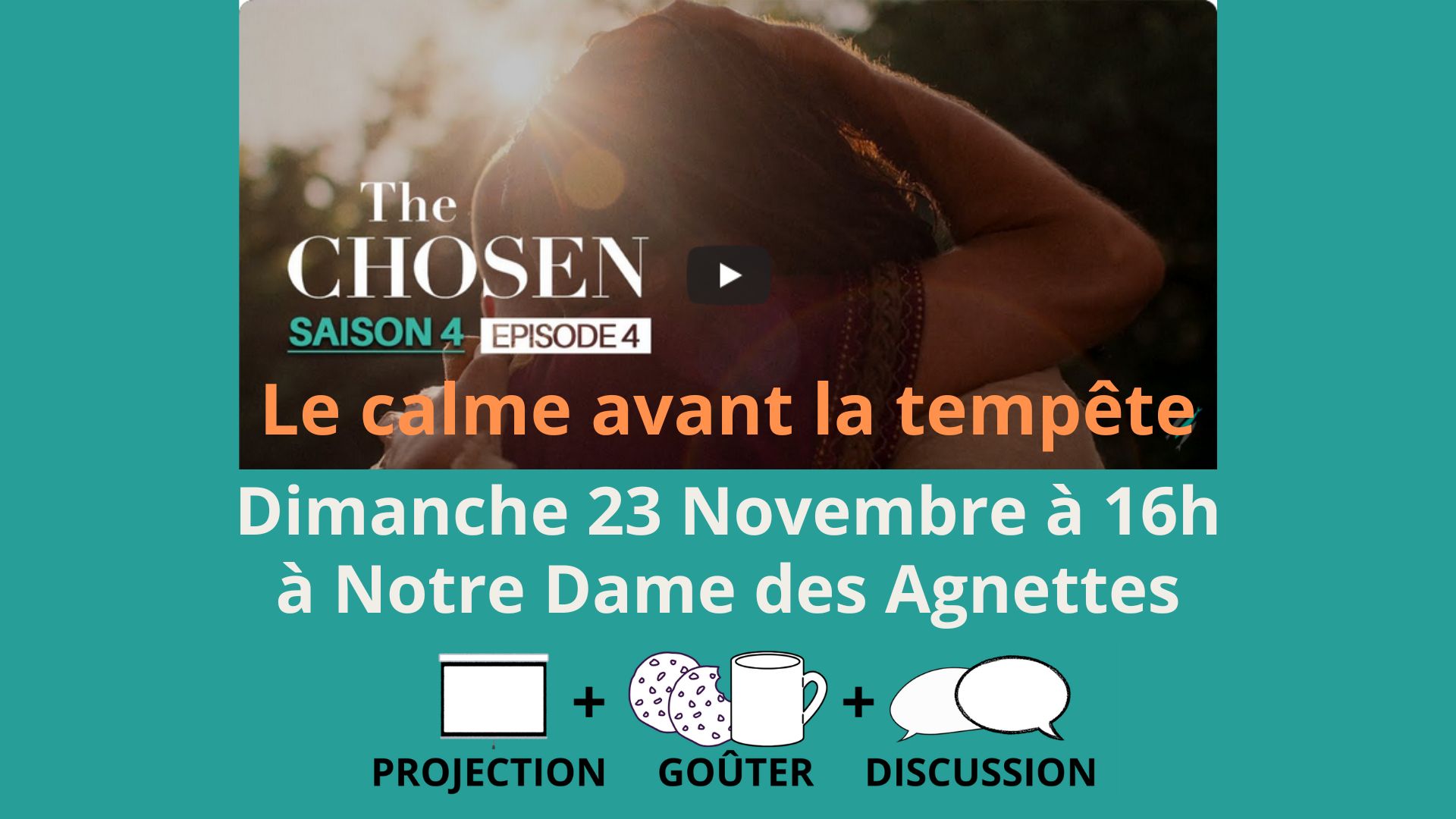 Projection du 4° des 8 épisodes de la Saison 4 de la série « The Chosen » : « Le calme avant la tempête » Dimanche 23.11 à 16h à ND des Agnettes (26, […]Lire la suite
